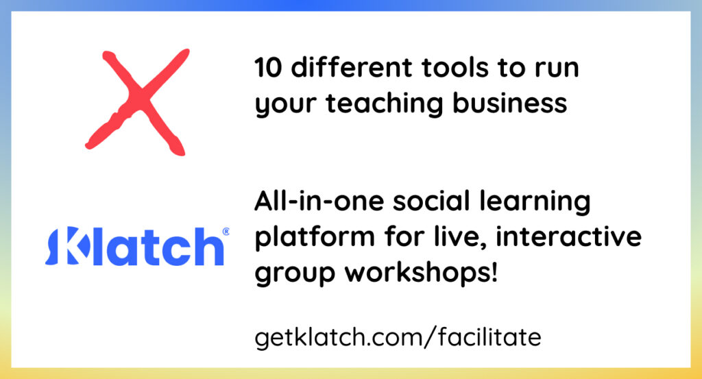 Klatch is a first-of-its-kind all-in-one social learning platform for live, hands-on, virtual workshops across every topic – from hobbies to professional development. Say goodbye to pre-recorded lectures and passive webinars; say hello to real-time, group-based learning. The Klatch platform enables experts to launch a workshop in minutes and provides the tools to unify their communities, grow their audience, and monetize their expertise. Apply to join the Klatch Facilitator community here or browse featured workshops here.