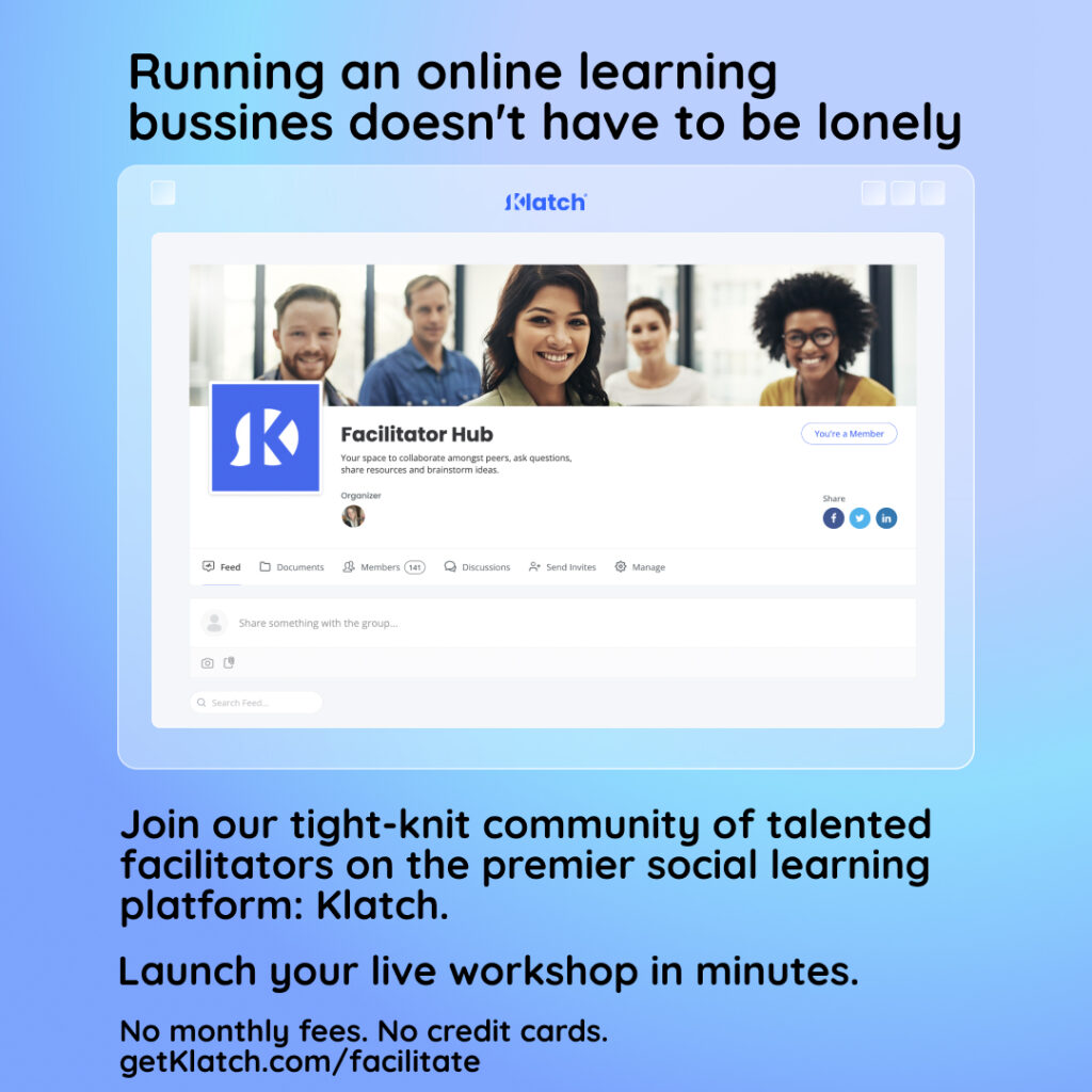 Klatch is a first-of-its-kind all-in-one social learning platform for live, hands-on, virtual workshops across every topic – from hobbies to professional development. Say goodbye to pre-recorded lectures and passive webinars; say hello to real-time, group-based learning. The Klatch platform enables experts to launch a workshop in minutes and provides the tools to unify their communities, grow their audience, and monetize their expertise. Apply to join the Klatch Facilitator community here or browse featured workshops here.